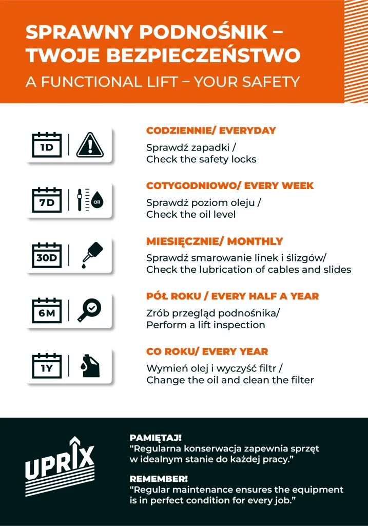 - Regularna konserwacja i przeglądy są kluczowe dla przedłużenia żywotności podnośnika oraz zapewnienia maksymalnej wydajności jego pracy.